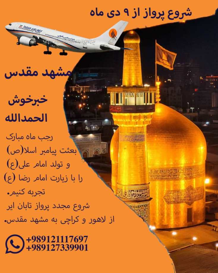 مجدد پرواز تابان از مشهد به لاهور و بالعکس از 9 دی ماه 1403 آغاز می‌گردد و اولین پرواز شامل پیشنهاد ویژه می‌باشد.